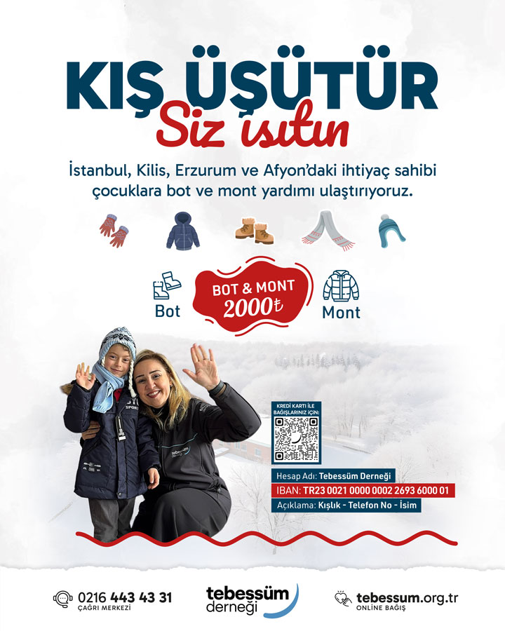 Soğuk hava yalnızca bedenleri değil, imkânsızlıklar içinde yaşayan kalpleri de üşütüyor. Biz, Tebessüm Derneği olarak bu kalpleri ısıtmak, onları kışa hazırlamak için çalışıyoruz. Siz de bu iyilik zincirine katılarak bir çocuğun hayatında kalıcı bir iz bırakabilirsiniz.